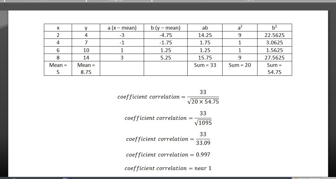 (2) Substract the value of x with the mean of x and it results a, and substract the value of y with the mean of y and it results b (check my attachment, column 3 and 4)