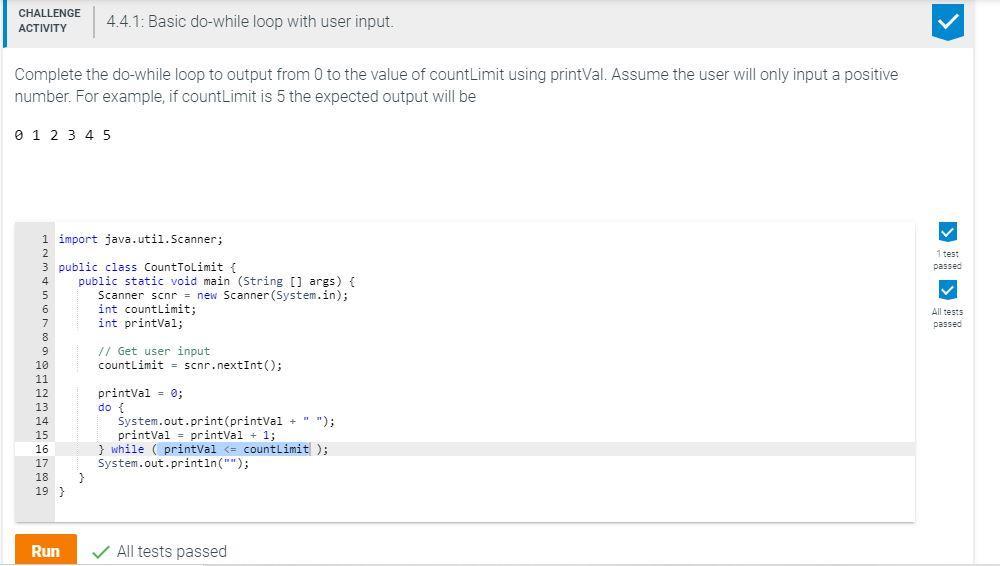 Complete the do-while loop to output every number from 0 to countlimit using printval. assume the user will only input a positiv