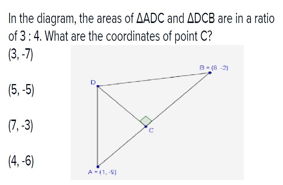 In the diagram, the areas of ADC and DCB are in a ratio of 3:4. what are the coordinates of point C