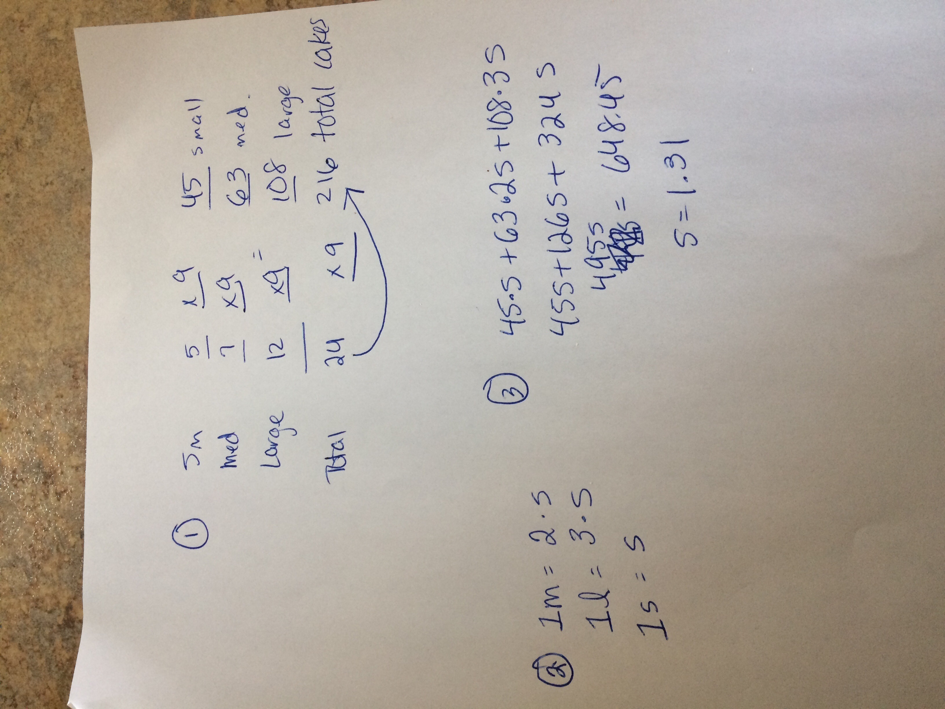 To answer this question you need to first set up the small, medium, large number of cakes as a ratio with a total. From here you will create a new ratio of the correct number of small medium and large Cakes sold using the total 216. The factor would be to multiply by nine. -Step 1 in picture. After this you would read what the relationship is between a medium and a small and the large and the small profits are - Step 2 in picture. After this you would represents the total profit based on the number of small medium and large cakes that were sold. Making this equal to L648.45. To find the profit for one small, you would then divide 648.45 by the 495 you got when you simplify the expression. The answer is L1.31.