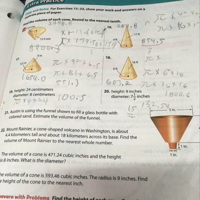 Austin is using a funnel shown to fill a glass bottle with colored sand Estimate the volume of the funnel number 21 please