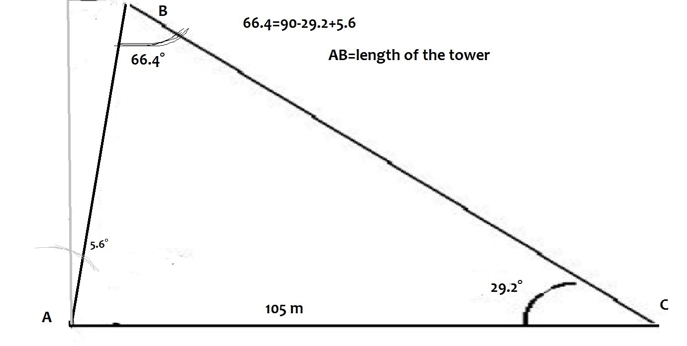 r leaning directly toward her. she measures the angle of elevation to the top of the tower to be 29.2. find the length of the tower to the nearest meter.