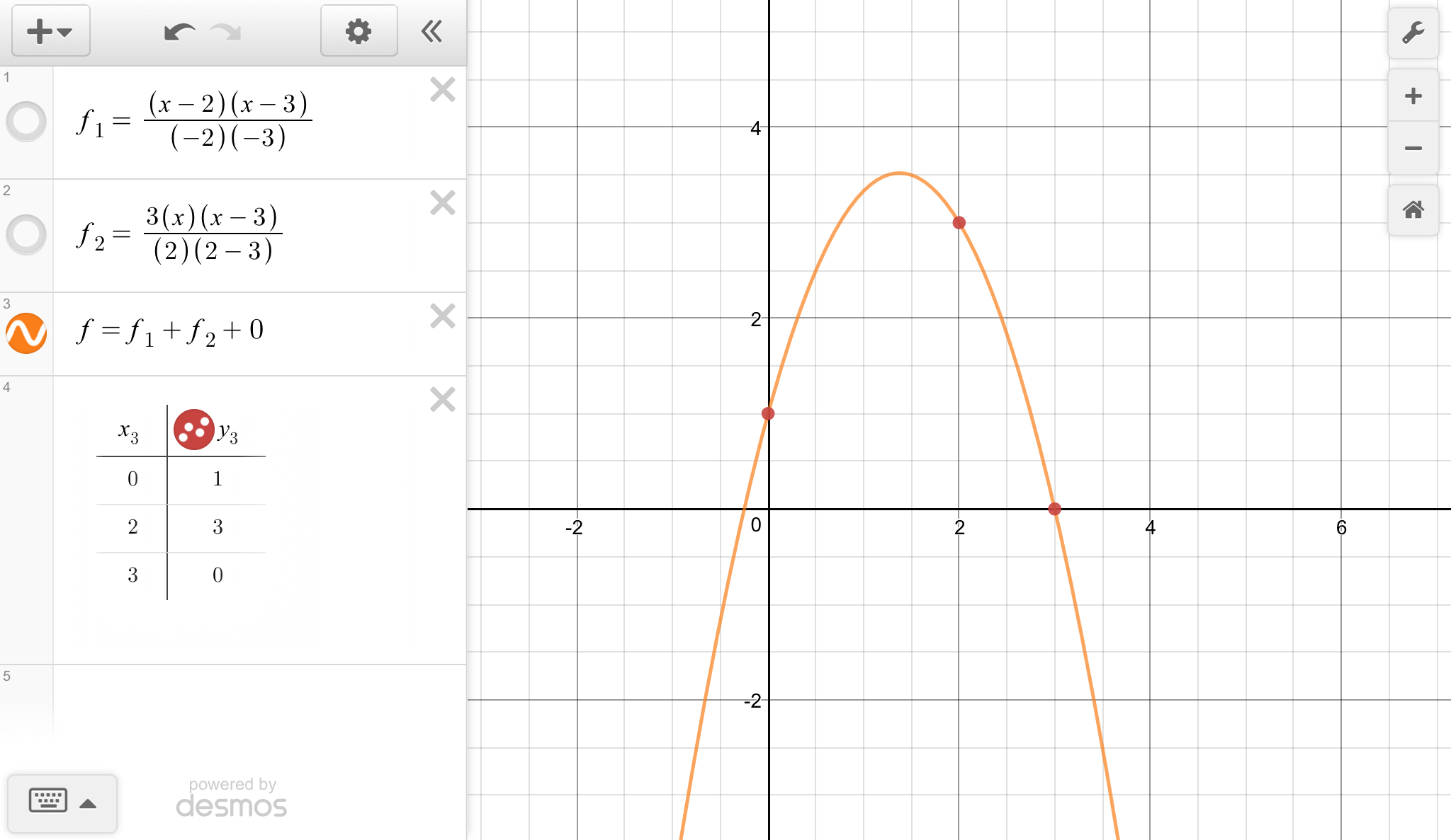 f(x)=1\times \frac{(x-2)(x-3)}{(0-2)(0-3)}+3\times \frac{(x-0)(x-3)}{(2-0)(2-3)}+0\times \frac{(x-0)(x-2)}{(3-0)(3-2)}