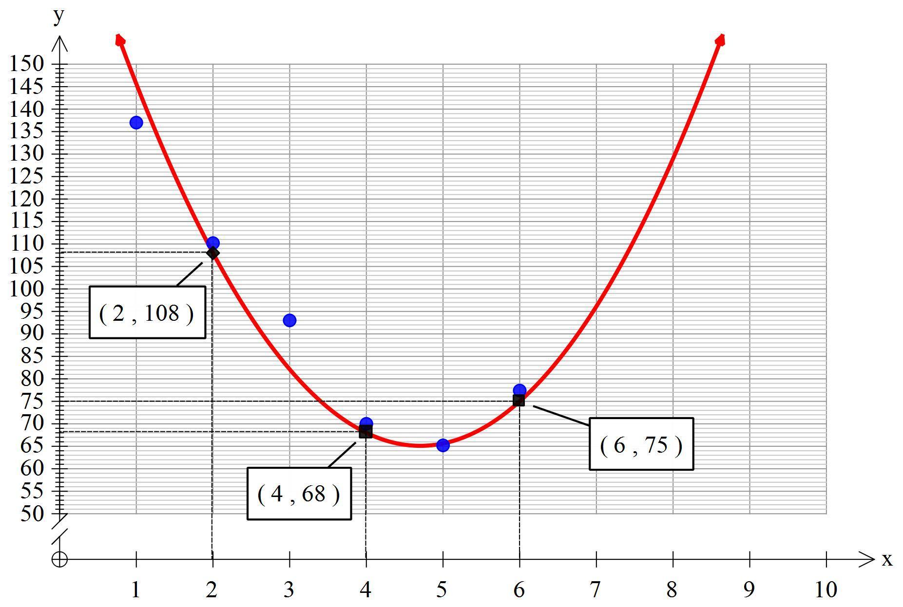 <span> parabola, which are (2, 108), (4, 68), and (6, 75).</span>