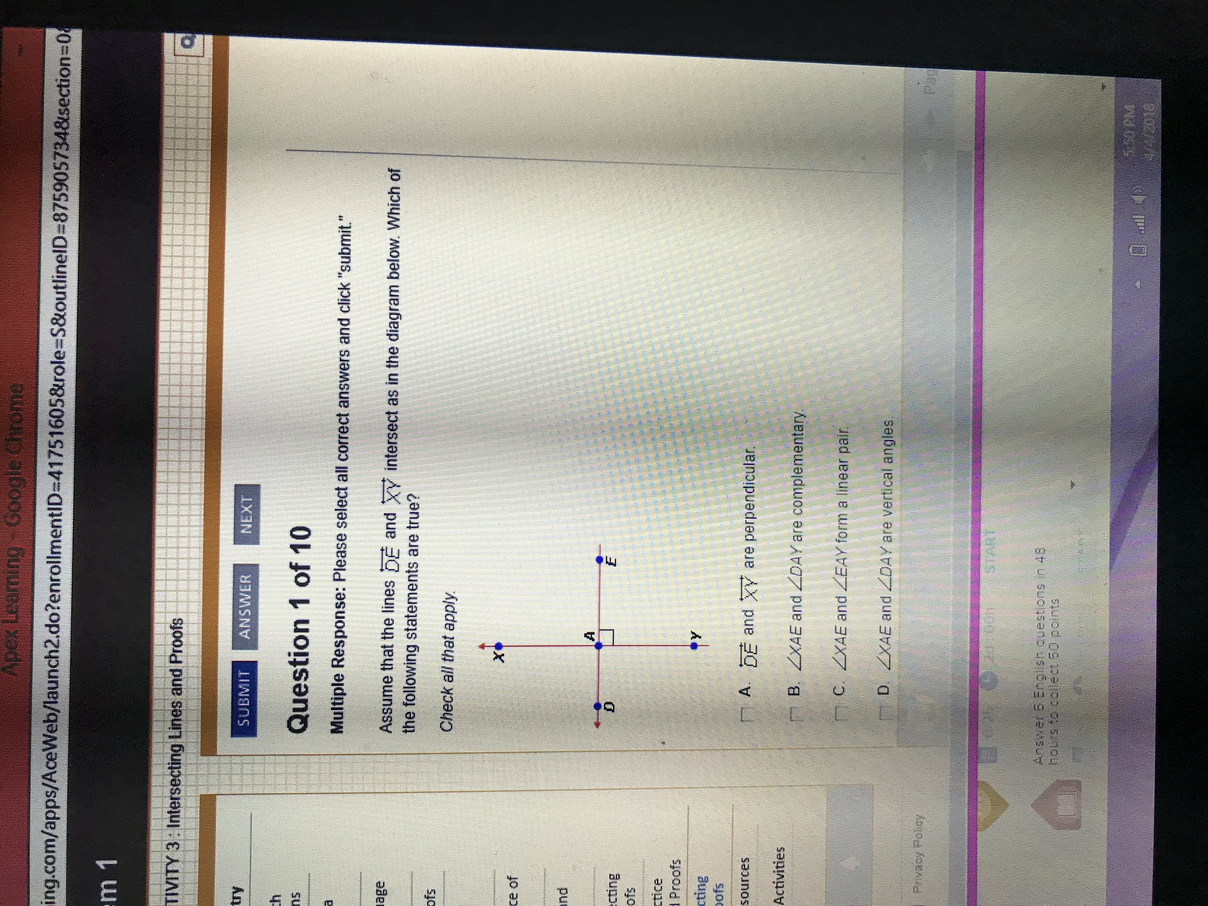The problem with B is that complementary angles are 2 angles that are related in such a way that they two angles add to 90o. That means that there are a couple of things wrong. First of all the two angles are on opposite sides of the vertical line XY. That makes them vertically opposite. Secondly, they add up to 180 since both of the are right angles. Third the only point they have in common is the intersection point at A.