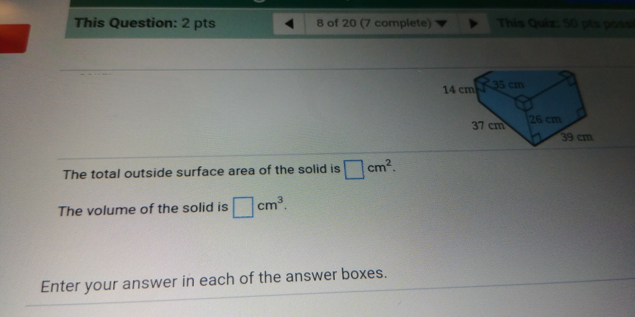 what is the total outside surface area ad the volume of tge solid figure with 14cm, 35cm, 37cm, 26cm, and 39cm