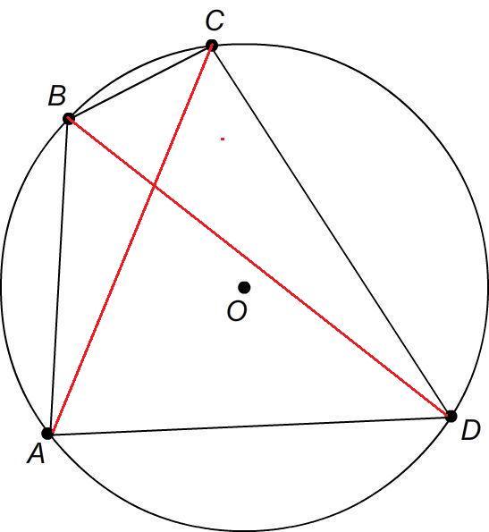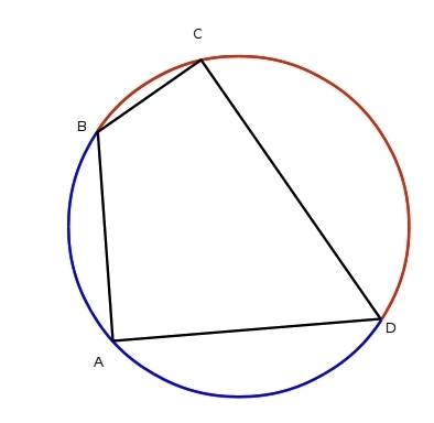 \bf \stackrel{2(\measuredangle A)}{\widehat{BCD}}+\stackrel{2(\measuredangle C)}{\widehat{BAD}}=360\implies 2A+2C=360\implies 2(A+C)=360