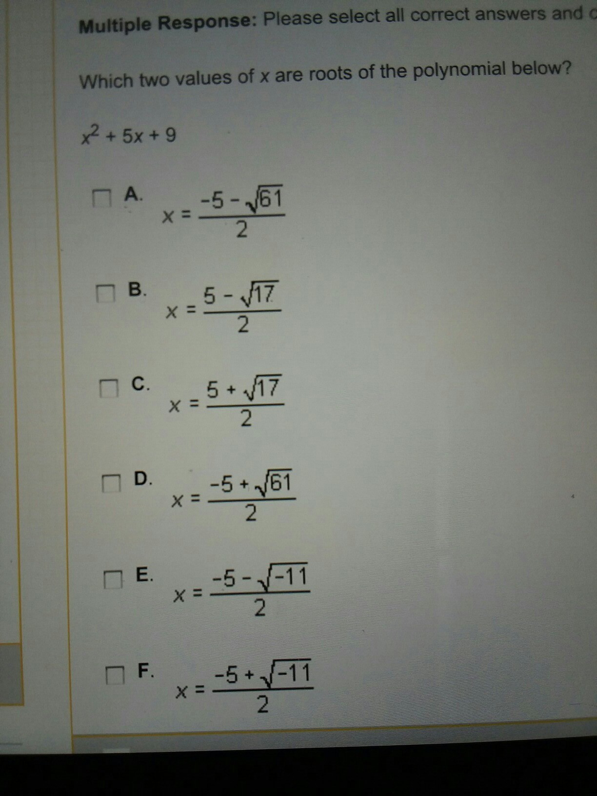 Which two values of x are roots of the polynomial below? x2+5x+9