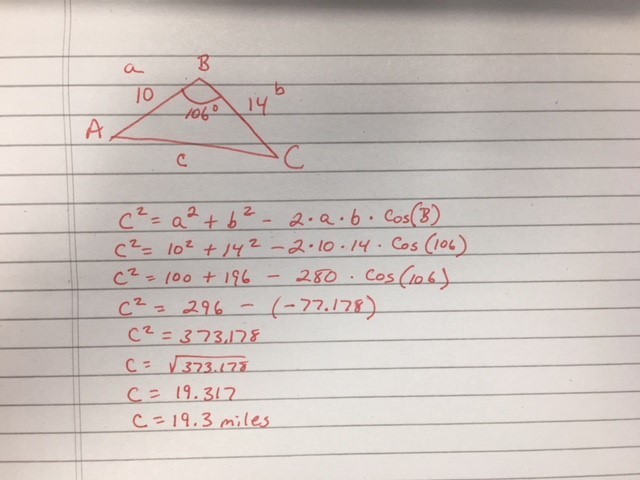 A ship travels 10 miles from Point A to Point B, makes a turn of 106 degrees, and travels 14 miles to Point C. If the ship trave