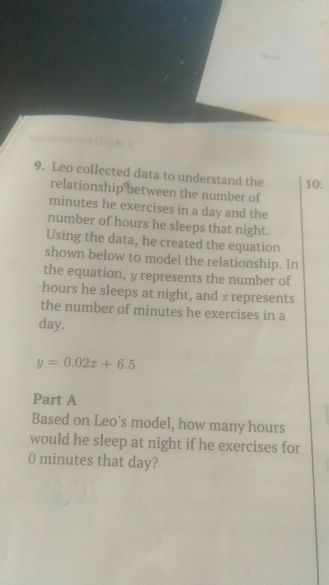 ours he sleeps that night. using the data, he created the equation shown below to model the relationship. In the equation, Y represents the number of hours he sleeps at night, and X represents the number of minutes he exercises ina day Y=0.02x+6.5