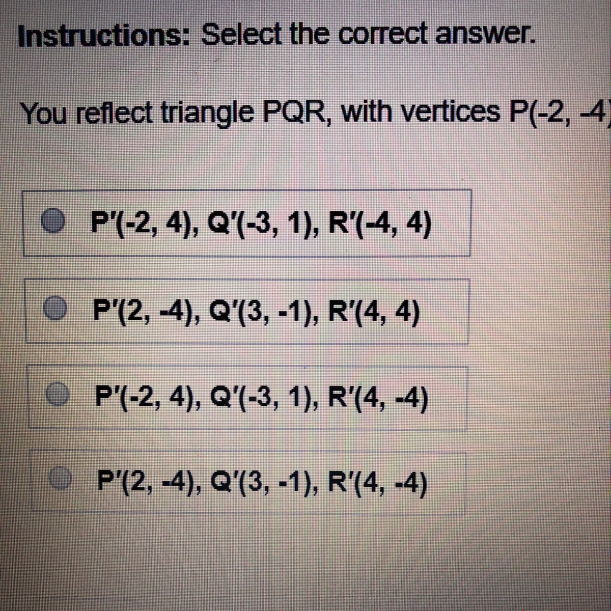 You reflect triangle PQR, with vertices P(-2, -4), Q(-3,-1), and R(-4,-4), across the y-axis to get triangle P’Q’R’. What are th