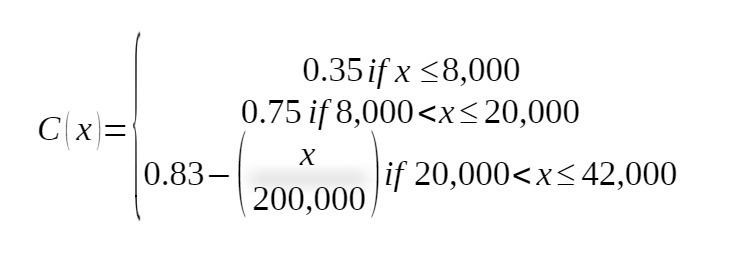 2. The function for the domain [12000, 38000] is just a linear equation that follows the form y = mx + b where m is the slope and b is the y-intercept. Since we have already calculated for the slope in the previous item, we will just compute the y-intercept. We will do this by using the point (38000,0.59) as our test point.