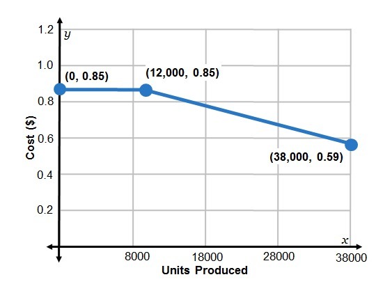 slope of the graph for production levels above 12,000. We find the slope by dividing the change in y over the change in x. The two points that we will utilize for calculating the slope are the given points (12000, 0.85) and (38000, 0.59).