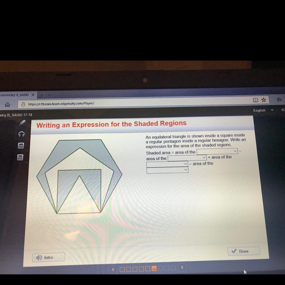 an equilateral triangle is shown inside a square inside a regular pentagon inside a regular hexagon. write an expression for the