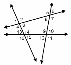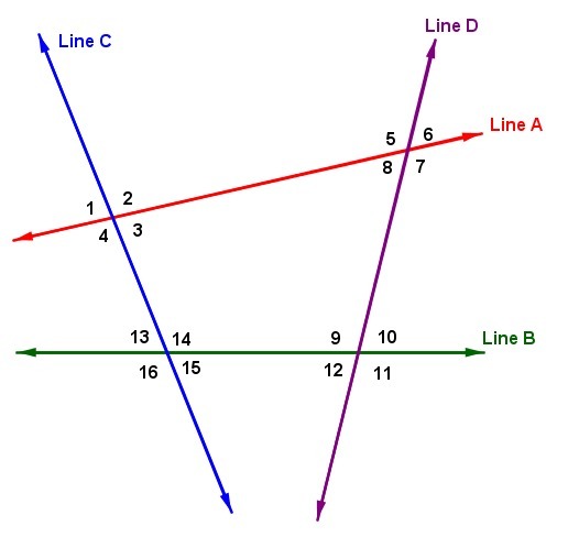 Note how I labeled the lines A through D (as well as color-coded them). Imagine if line A and line B were made to be parallel lines. Line D is the transversal cut that helps generate angle 5 and angle 11. We'll be focusing on this tranversal. Ignore line C entirely for now.