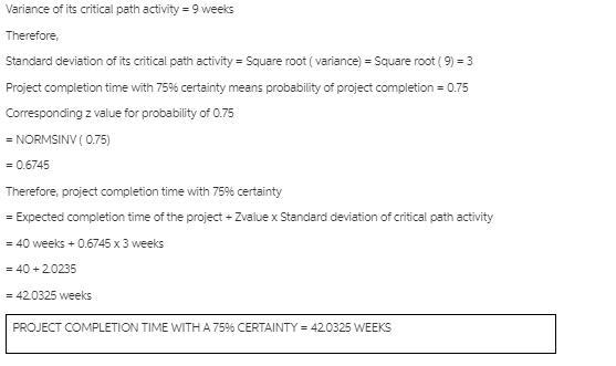 Keywords: expected completion, time of a project, 40 weeks, variance, critical path activities, 75% certainty, completion time, time duration, minimum, expected time, z-value, standard deviation, normal distribution.