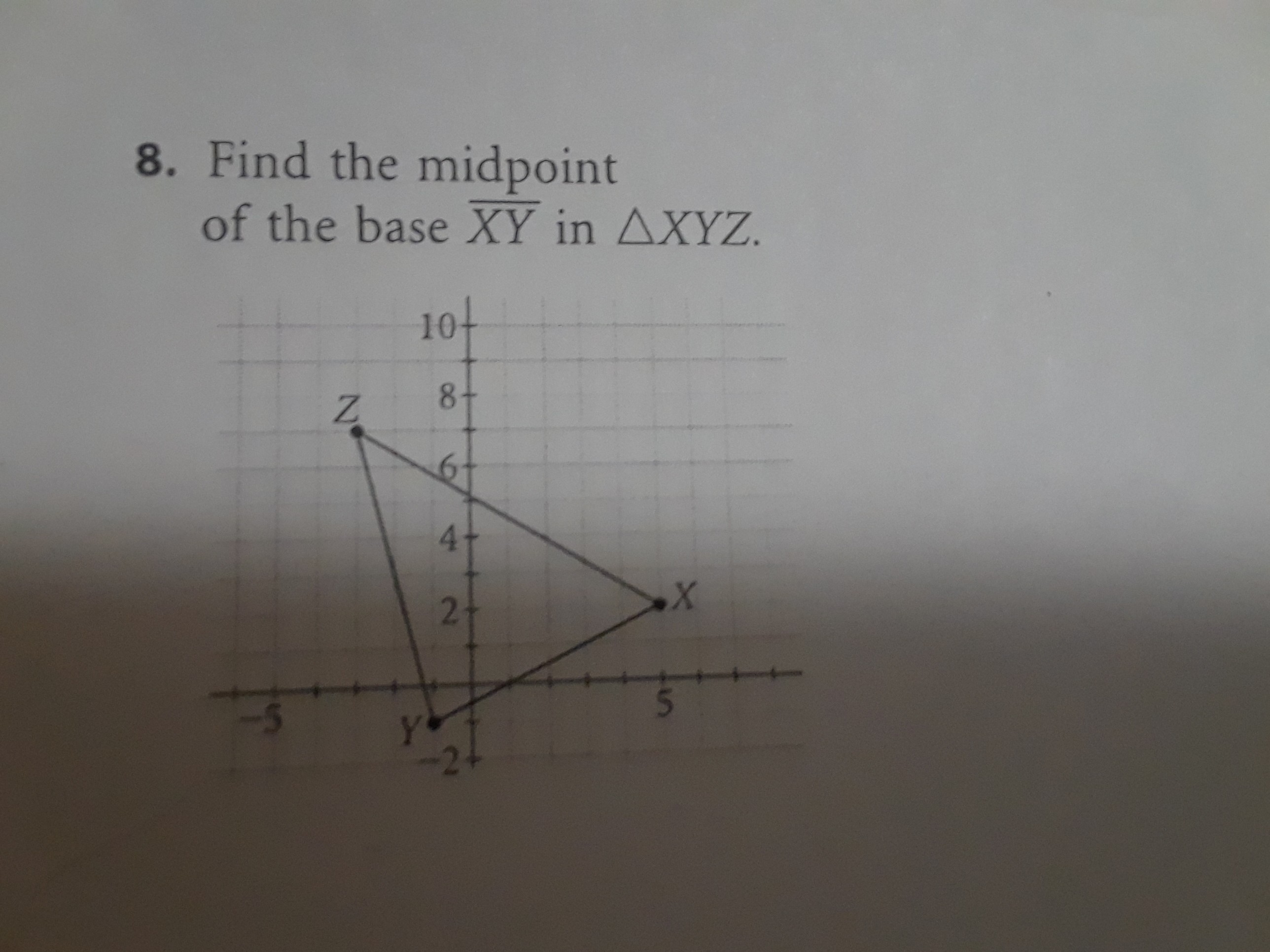 To find the midpoint of a line use the midpoint formula which is M = (x1+x2/2 , y1 +y2/2) After plugging in the coordinates for your variables you should get (-1+5/2, -1+2/2) This simplifies to (2, 1/2) which is the coordinates for the middle point of the base XY.
