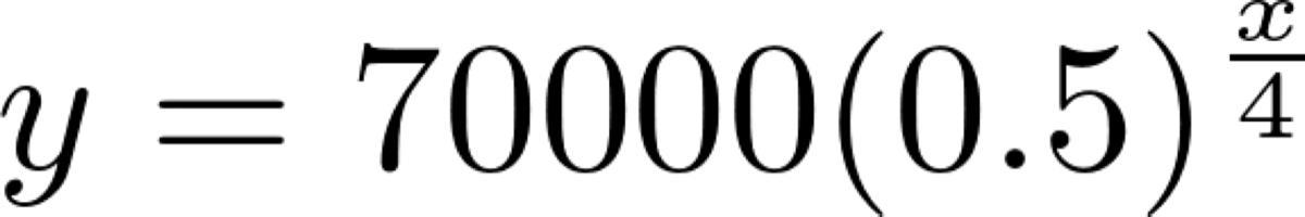 y = 70000(0.5)^(x/4), where x equals the number of hours.