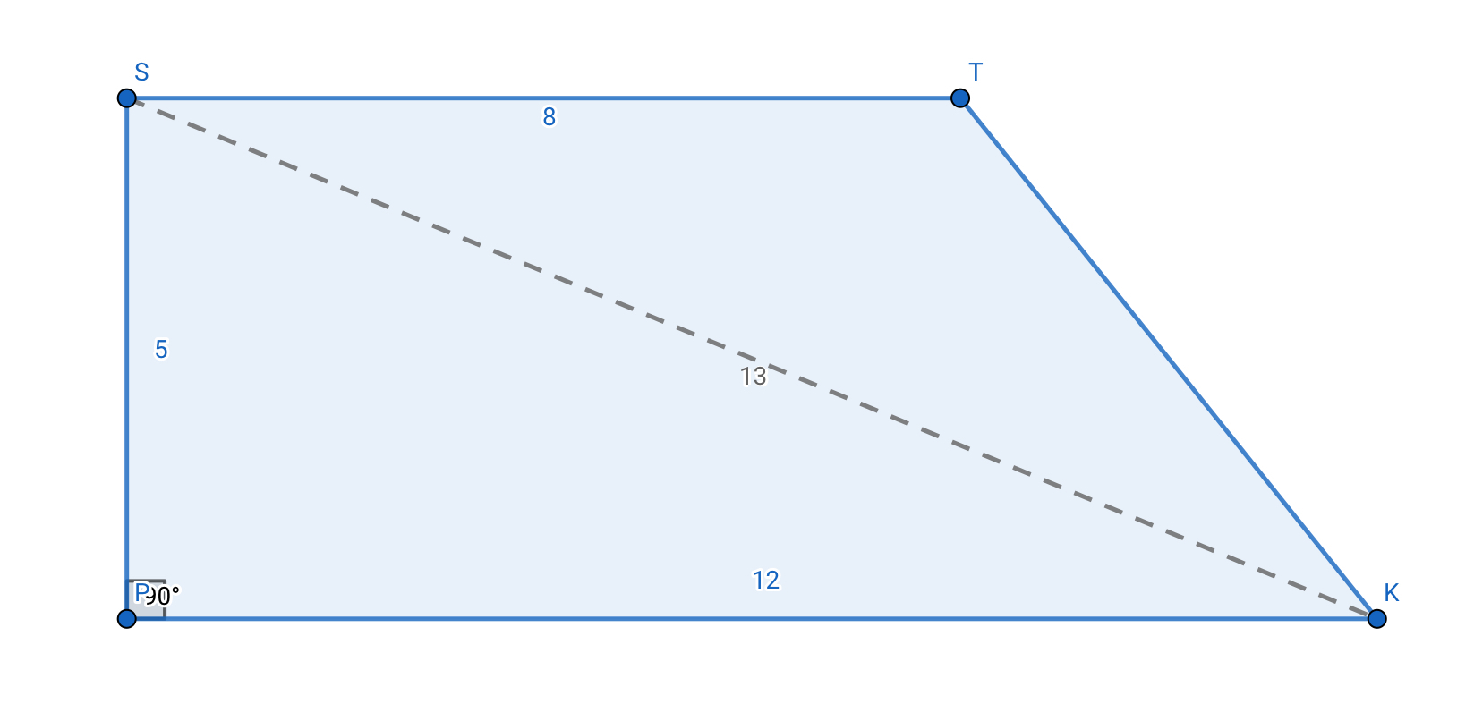 trapezoid PSTK with ∠P=90°, KS = 13, KP = 12, ST = 8