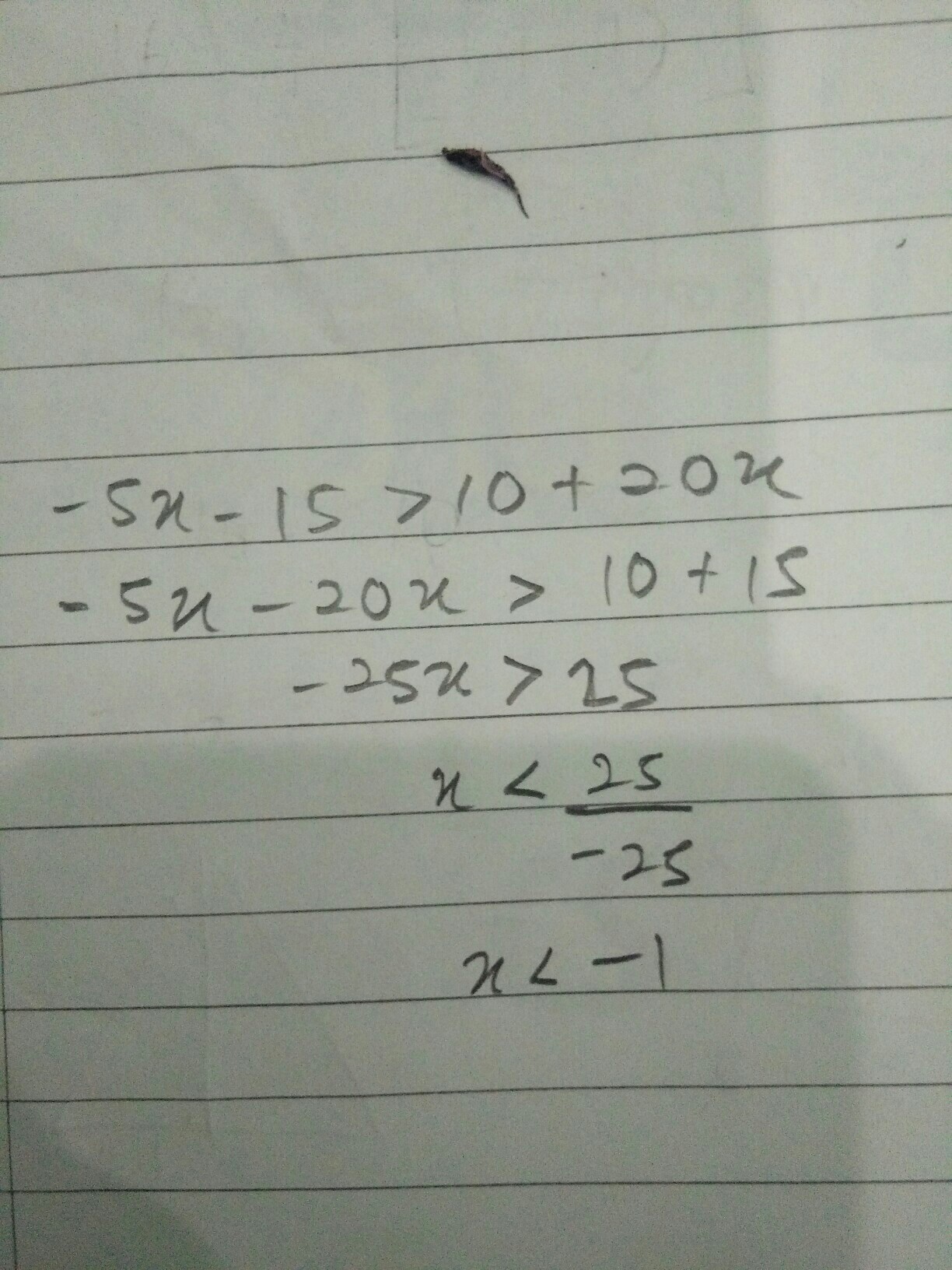 -5x (-20x) - 15 (+15) > 10 (+15) + 20x (-20x)