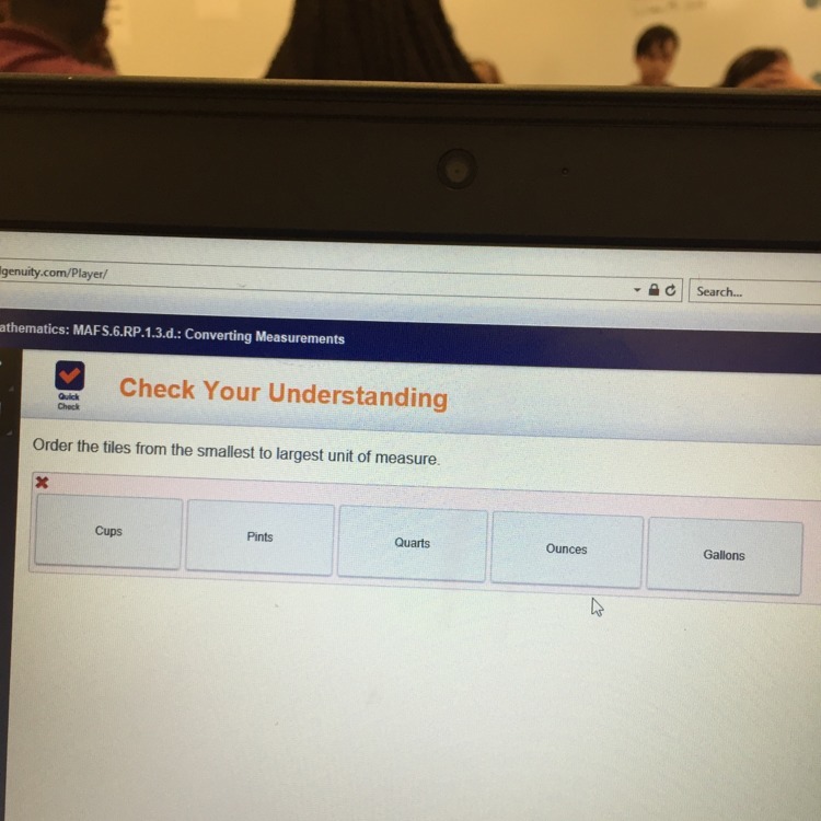 Therefore, the correct order of the tiles from smallest to largest unit of measure is Ounces, Cups, Pints, Quarts, Gallons.