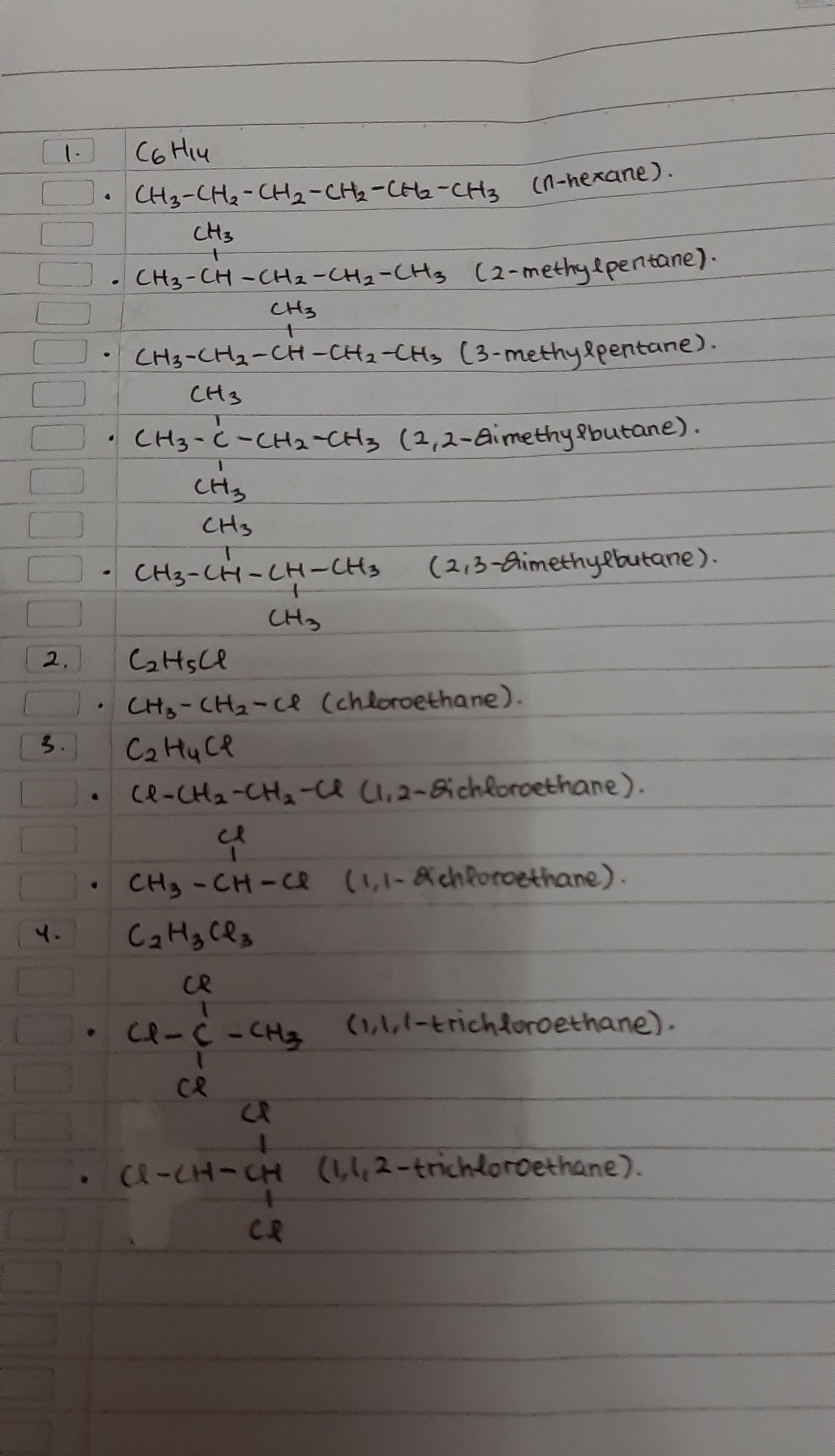 1.35 Draw structures for all constitutional isomers with the following molecular formulas: (a) C6H14 (b) C2H5Cl (c) C2H4Cl2 (d )