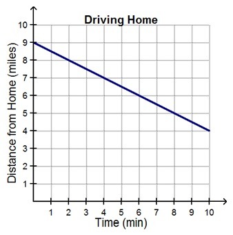 Looking at the graph, we can see that the number of miles from home decreases by 1 for every two minutes.  Since the distance is decreasing, this means that the bus is getting closer to home.  Since it decreases by 1 mile every 2 minutes, this means that the speed is 1/2 mile per minute.