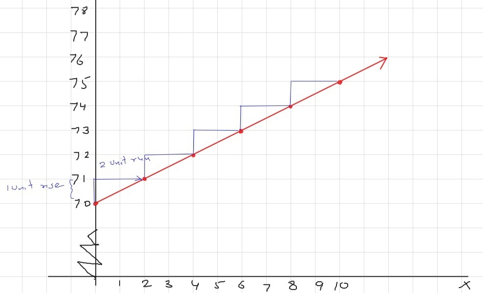 So, in order to graph it, we need to plot y-intercept at 70 first and then plot some more points using rise/run = 1/2.