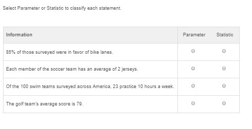 2) Each member of the soccer team has an average of 2 jerseys = PARAMETER (This is a <em>parameter </em>because of the fact that defines a minimum limit of 2 jerseys held by each member of the soccer team. This could also be a factor in a study as a question like yes or no.)