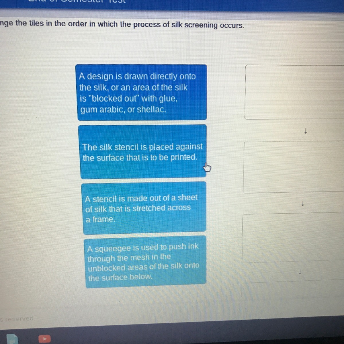 Silk screen printing is a technique used to transfer a stencilled design onto a flat surface using a mesh screen, ink and a squeegee. The basic method consists on creating a stencil on a fine mesh screen and then pushing ink (or paint) through to create an imprint of the design. So, the complete process would be: 3. A stencil is made out of a sheet of silk that is stretched across a frame, 1. A design is drawn directly onto the silk, or an area of the silk is "blocked out" with glue, gum arabic, or shellac. 2. The silk stencil is placed against the surface that is to be printed. 4. A squeegee is used to push ink through the mesh in the unblocked areas of the silk onto the surface below.