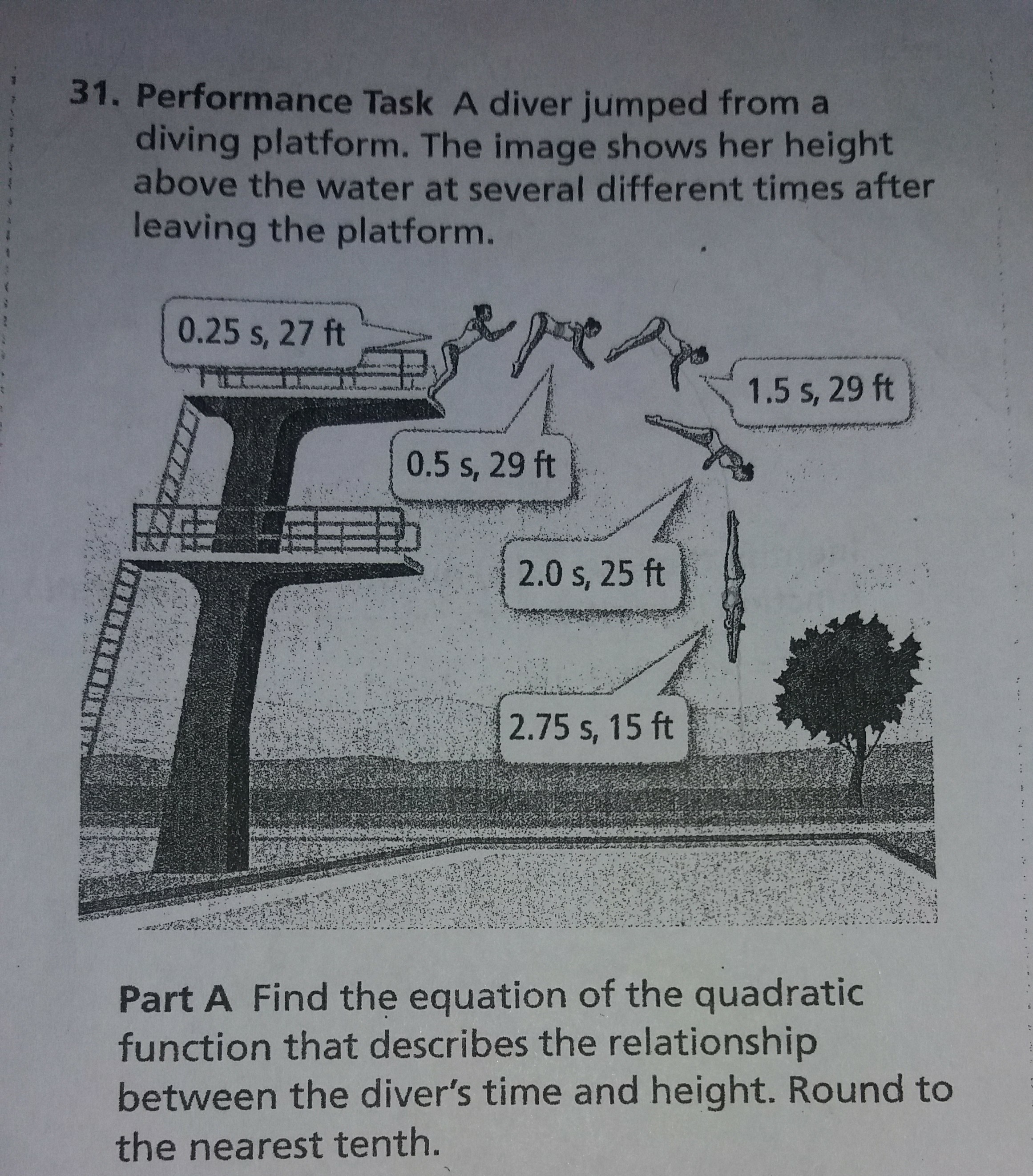 Part A - Find the equation of the quadratic function that describes the relationship between the diver's time and height. Round to the nearest tenth.