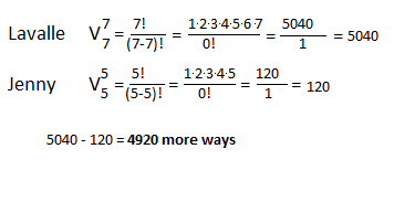 lavalle has 7 math books to line up on a shelf. jenny has 5 english books to line up on a shelf. in how many more orders can lav