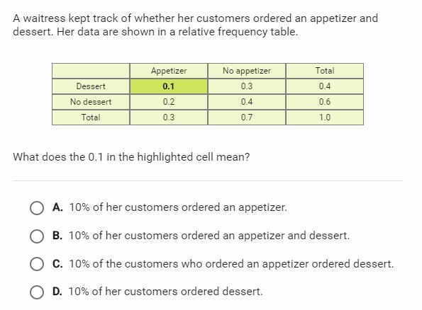 A waitress kept track of whether her customers ordered an appetizer and dessert. Her data are shown in a relative frequency tabl