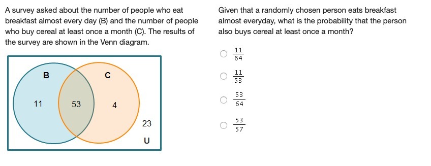 Given a venn diagram in picture representing two sets.  The blue set B represents the number of people who eat break fast almost every day. the orange set C represents the number of people who buy cereal atleast once a month.