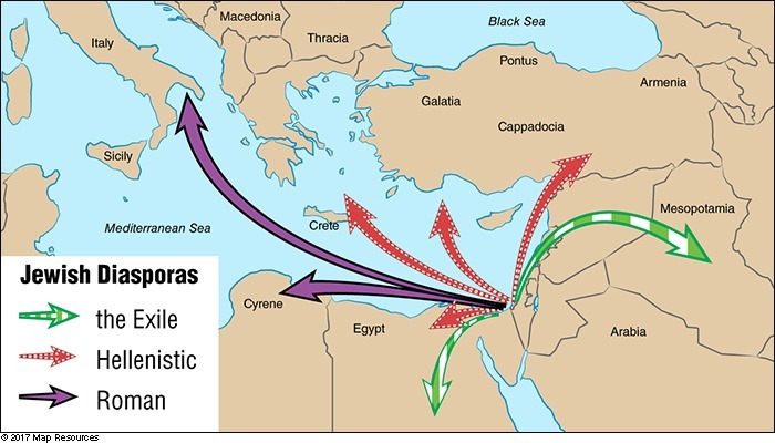 On the map below, retrace the three Jewish diasporas and name them. For example, what year did they happen, and where did the Je