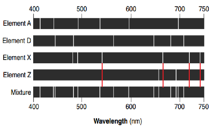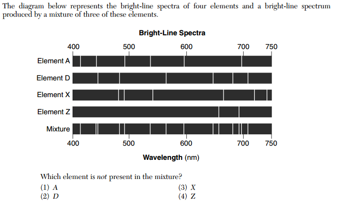 The diagram below represents the bright-line spectra of four elements and a bright-line spectrum produced by a mixture of three