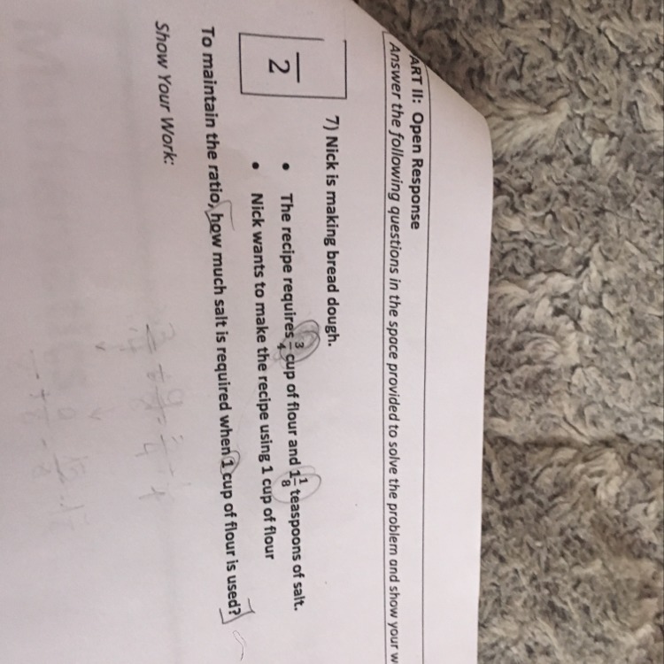Your answer is: To maintain the ratio, when 1 cup of flour is used, <u>1.5 teaspoons of salt are required.</u> <em>OR</em> <u>1 1/2 teaspoons are required.</u> <em>OR</em> <u>1 and a half teaspoons are required.</u>