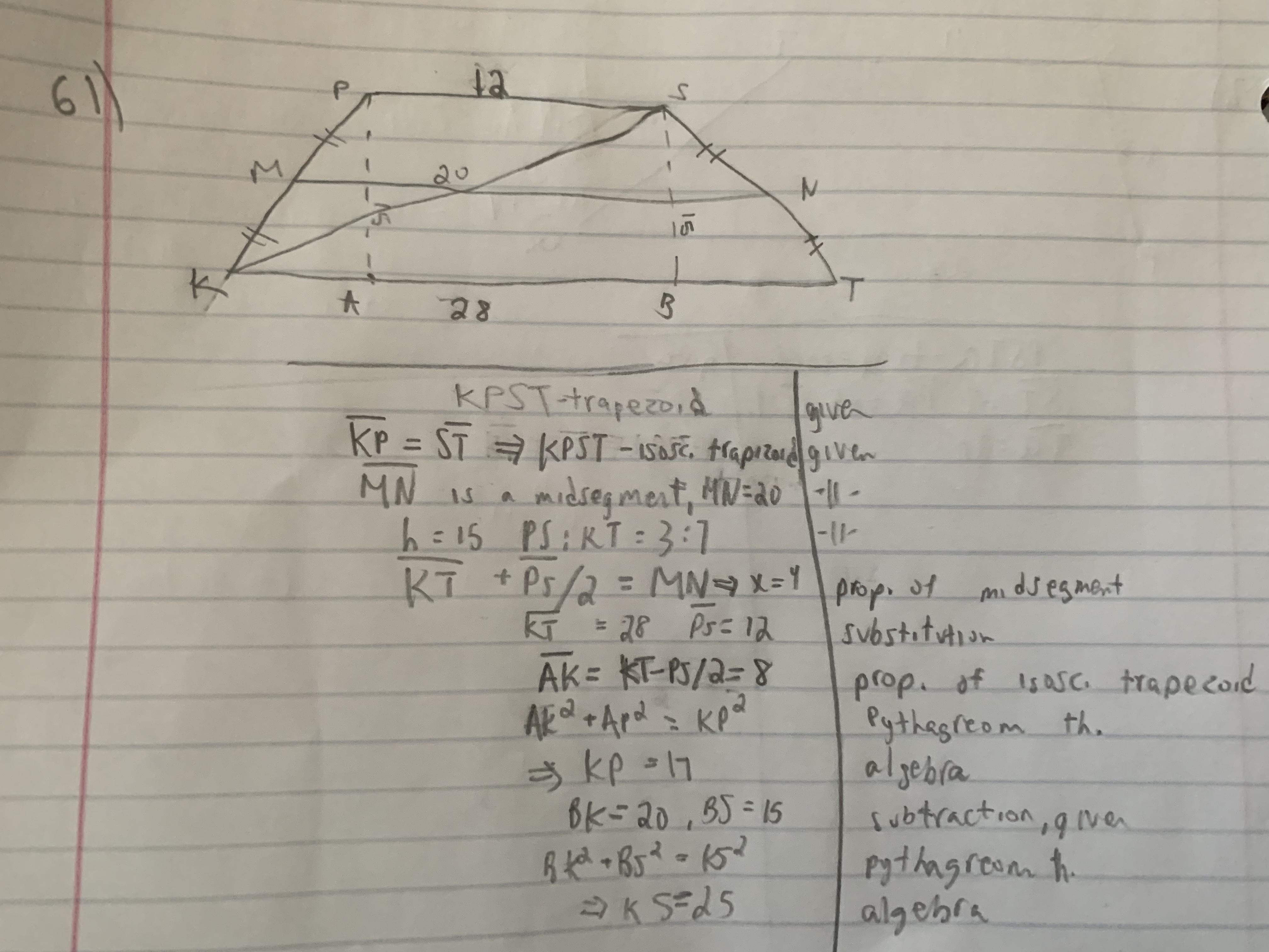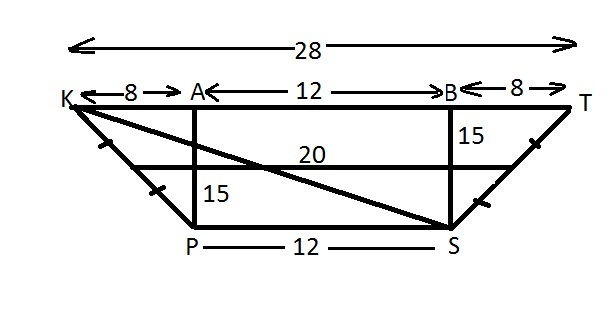 Given information: KPST is a trapezoid, KP=ST, MN is a mid segment, MN=20, h=15, PS:KT=3:7 .