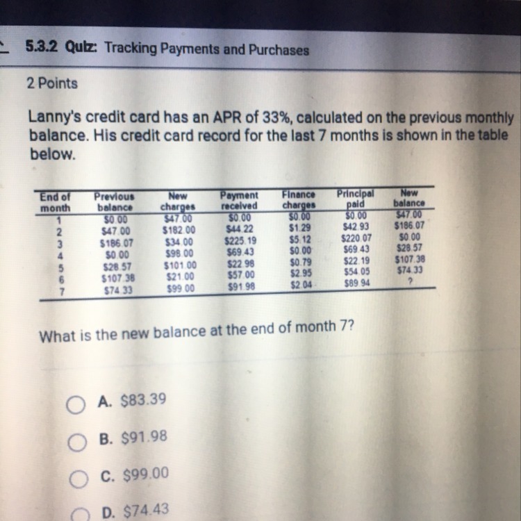 Lanny’s credit card has an apr of 33%, calculated on the previous monthly balance. His credit card record for the last 7 months
