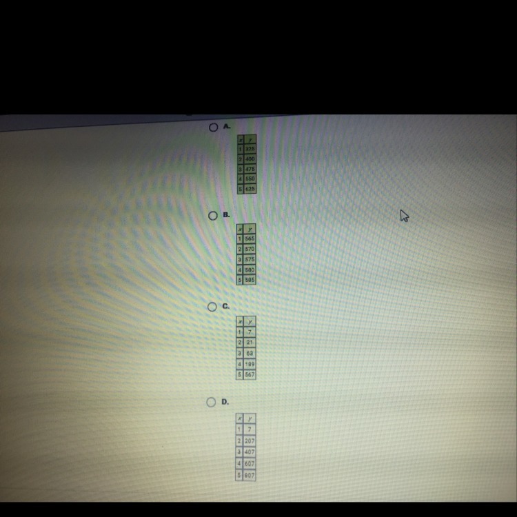 Exponentials are the fastest growing functions. In this case, the values in table (C) exhibit an exponential growth in that for every increase in x there is a tripling of the previous value. This would correspond to x being a power of the base 3.