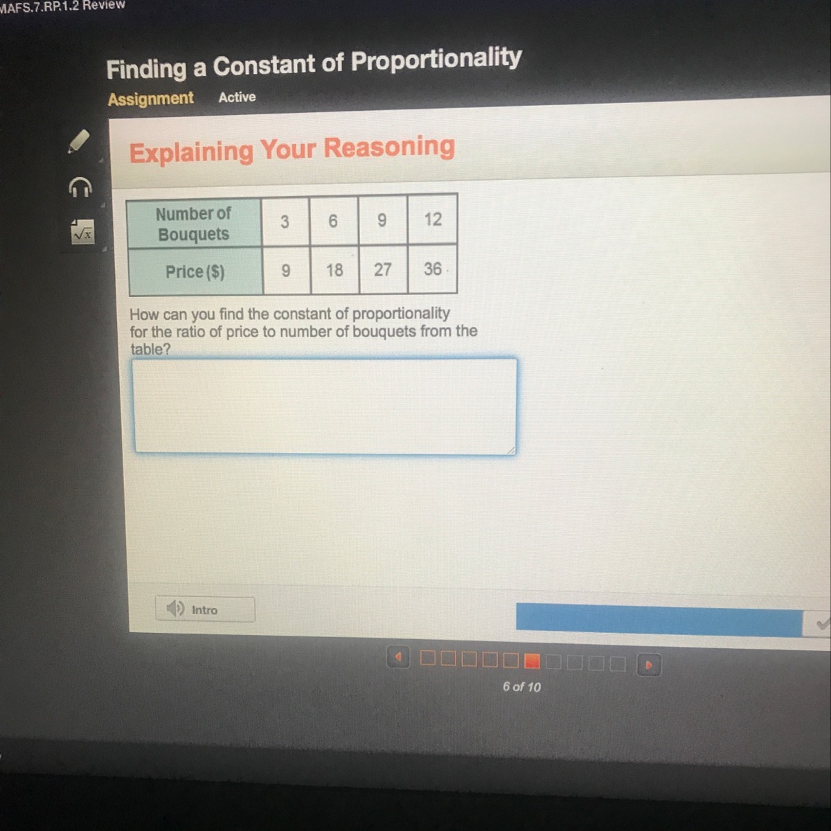 Divide the price of each bouquet by the number of bouquets for each set of values. All the ratios are 3, which is a constant of proportionality of 3.