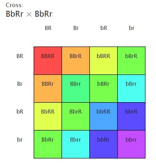 The concept of this is taking each combination of the traits from the parent (BR, Br, br, bR), and crossing it with such combinations of the other parent.
