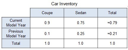 Consideration "There is a 10% chance that the car is a coupe." makes no sense because, in order for this to be true, 90% of specific models would be a sedan which table clearly shows 25%.
