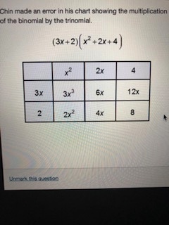 the chart? The expression 3x3 should be 3x2. The expression 6x should be 6x2. The expression 4x should be 4x2. The expression 2x2 should be 2x3.