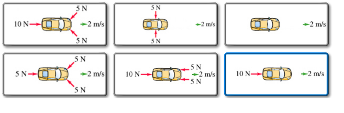 Below are birds-eye views of six identical toy cars moving to the right at 2 m/s. Various forces act on the cars with magnitudes