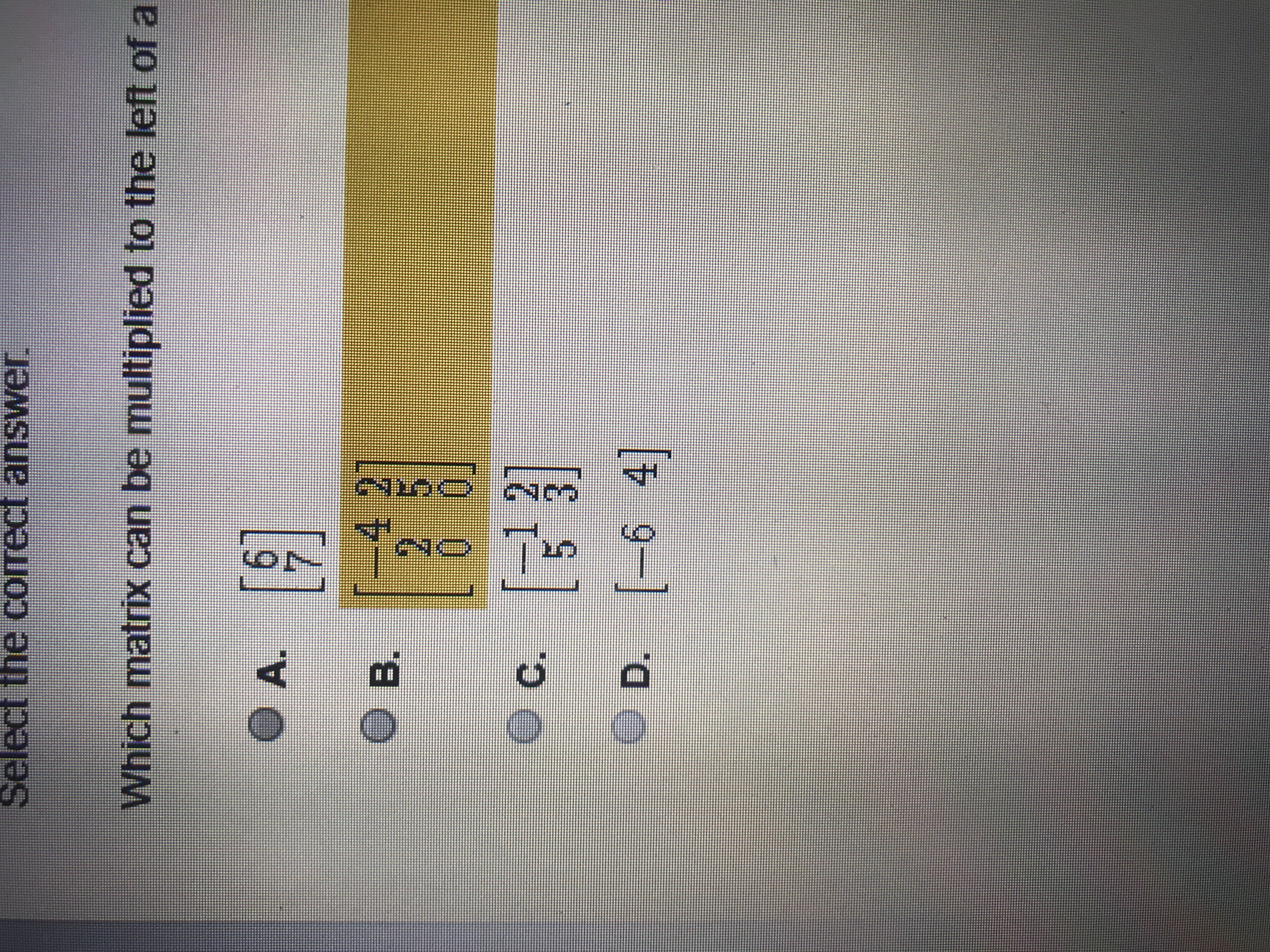 Step-by-step explanation:  We are given four options and we are to select which matrix can be multiplied to the left of a vector matrix to get a new vector matrix. The order of a vector matrix is either n × 1  or  1 × n.
