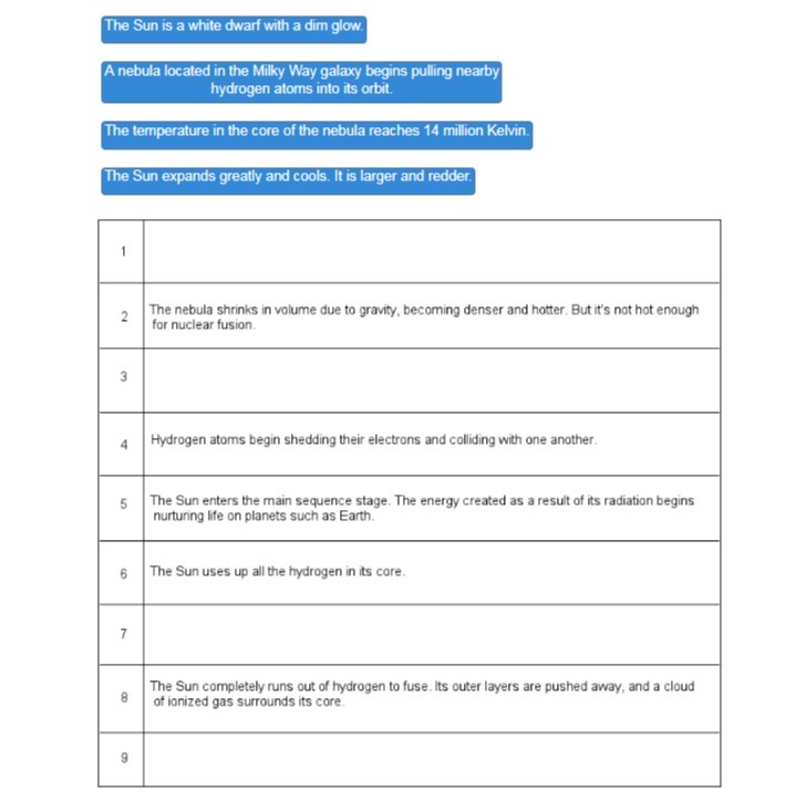 5. The Sun enters the main sequence stage. The energy created as a result of its radiation begins nurturing life on planet such as Earth.