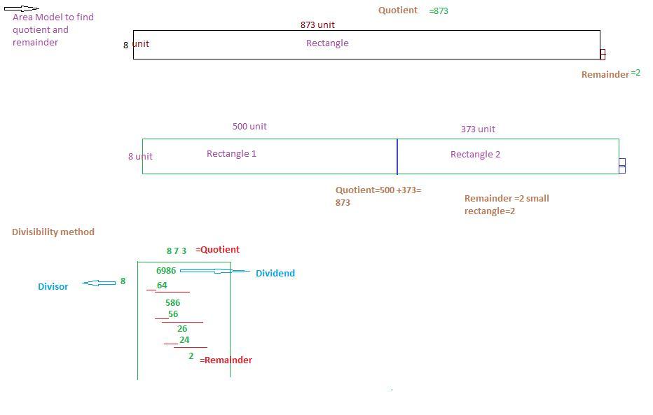 To find the quotient and remainder ,using area model, when , 6,986 is divided by 8,we will use rectangles of different Dimensions or a single rectangle in this process.