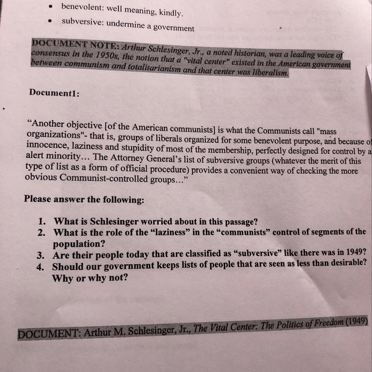 Schlesinger's concern is about the influence that the Communist Party had over those groups and how its power was increasing through groups that "disguised" as something else but were actually under control of the Communist Party and the party could eventually use the individuals that belonged to those groups to achieve their goals and many times, the individuals used wouldn't even be aware of it.