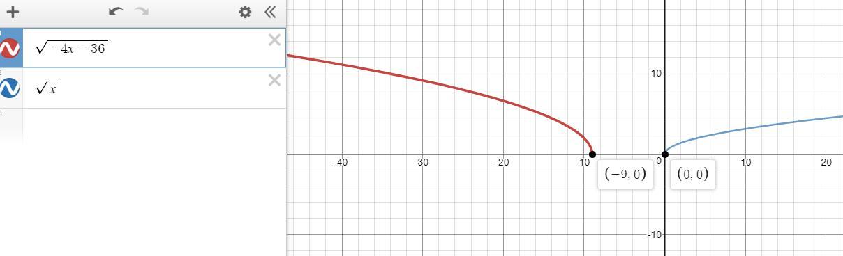 which of the following describes the graph of y= sqrt -4x-36 compared to the parent square root function?